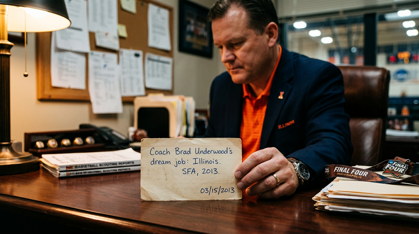 In 2013, Brad Underwood was coaching at Stephen F. Austin, a Southland Conference program in Nacogdoches, Texas, population 33,000. He had never been a head coach at a Division I school. His resume included a decade as an assistant at Western Illinois — 140 miles from Champaign, close enough to watch Illinois build and dismantle basketball programs in real time — and a stint at Dodge City Community College where he went 62-60. He was 49 years old. He had been coaching for 27 years. Nobody in the national media knew his name.